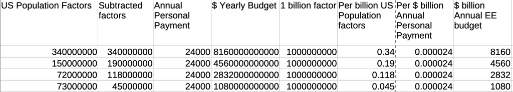 In the Embedded Employment spreadsheet table the left column shows US population factors. The initial factor is the total US population at 340 million. Paying everyone $2k monthly requires $8.2 trillion. The next factor are employed US citizens at 150 million. This number assumes everyone is making at least $2k monthly. The 150 million employed Americans totals $3.6 trillion in reimbursements to the Federal government resulting in a net $4.6 trillion in EE payments. Next we have the US population factor of 72 million Americans on Social Security who today are paid on average $2k monthly. This is where the $2k monthly figure was derived. This subtracts another $1.7 trillion from the previous $4.6 trillion leaving a net annual payment of $2.8 trillion. Now, if we wanted to include children in the EE annual budget this is what it would cost. However, the 2026 EE program only considers adults. So the final US population factor subtracts the 73 million minors. Subtracting the 73 million minors subtracts $1.8 trillion from the previous $2.8 trillion leaves just $1.1 trillion for 45 million Americans.